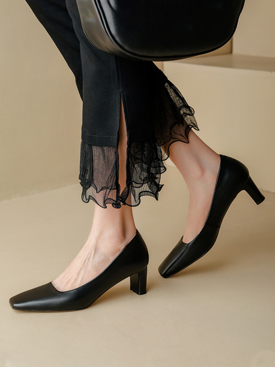 รองเท้าส้นสูงดีไซน์เบสิกที่โดดเด่น ด้วยส้นเหลี่ยมแบนสูง 6 ซม. เหมาะสำหรับสาวออฟฟิศที่ต้องการเสริมเรียวขาและรูปร่างให้ดูดี